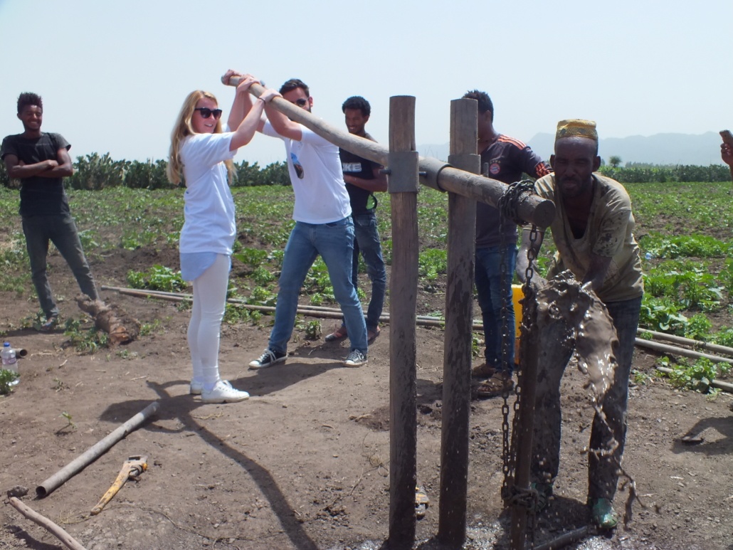 Bij een werkbezoek steken we natuurlijk ook zelf de handen uit de mouwen! In Alamata waren opgeleide teams irrigatieputten aan het boren. Het bezoek uit Nederland mocht meehelpen, om zo zelf te ervaren hoe het boren van een put in zijn werk gaat.