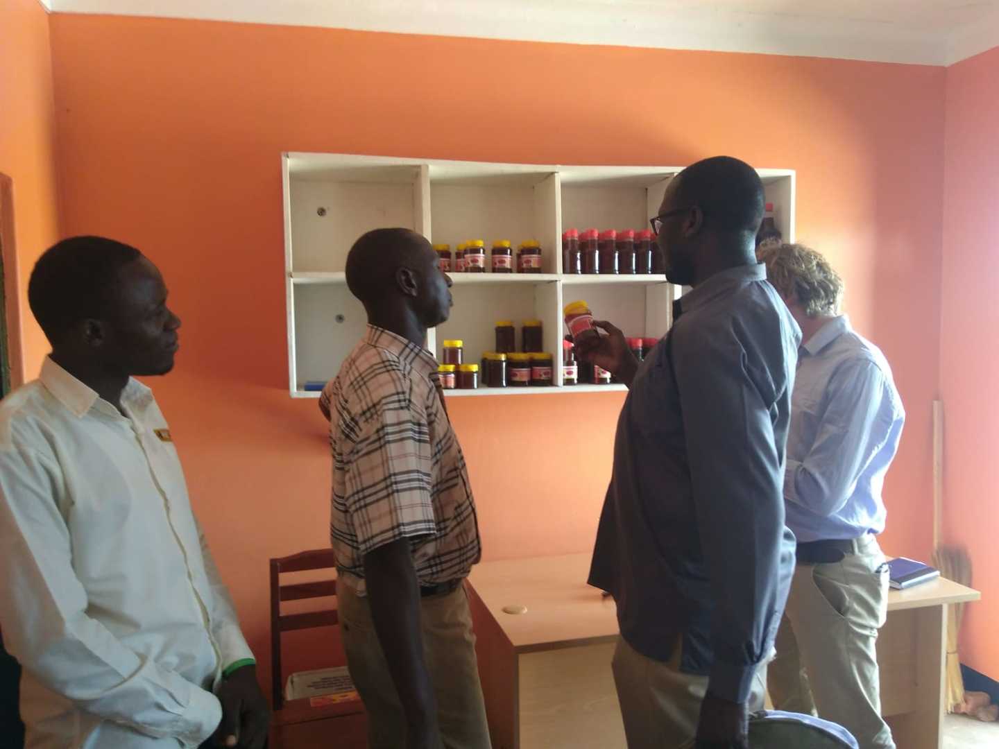 Ojok laat ons de winkel van HIVE zien. Binnen staan vijf naaimachines die door het Bee Diverse Matching Fund (BDMF) zijn gefinancierd. Hier worden bijenpakken genaaid. Het doel is om gehandicapten, jongeren en vrouwen aan werk te helpen. Ojok presenteert de winkel vol trots. Hij heeft plannen om de winkel op te knappen en verder op te bouwen. Daarmee hoopt hij een win-winsituatie te creëren: de werknemers hebben profijt bij hun baan en inkomsten en de imkers zijn geholpen met lokaal beschikbare (en beter betaalbare) imkerpakken.