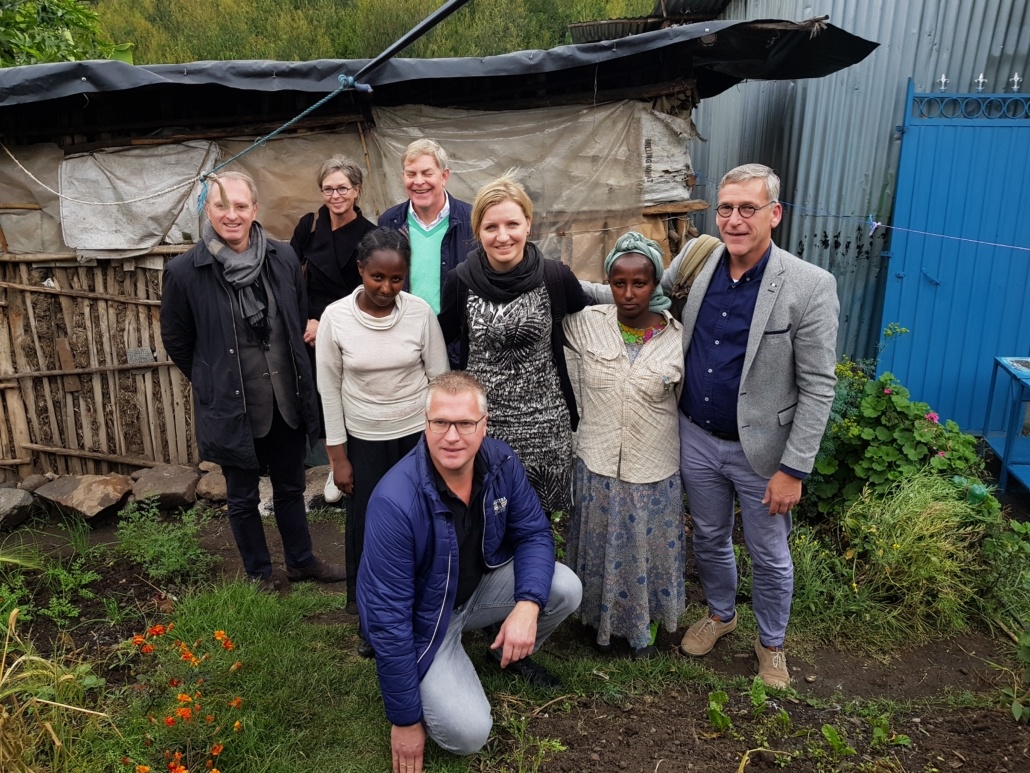 Vervolgens hebben wij twee bezoeken afgelegd bij studenten thuis. We zijn afgereisd naar een van de armste wijken waar wij de woning van Yared bezochten. Yared leert voor elektricien en heeft in dit huisje zelf de elektriciteit aangelegd. Voor de bouw van het huisje stelt de gemeente voor deze wijk het houten geraamte voor de muren en het dak beschikbaar, Casco dus. De afbouw moeten de bewoners doen. De woning kent geen keuken en geen sanitair. Op de foto is een trotse vader en zoon te zien. De moeder van Yared is overleden. Daarna zijn wij naar de woning, of beter gezegd naar de hut van Toyba gereden. Zij woont hier met haar moeder. Deze is met Hiv besmet. Toyba is de op een na beste student van haar opleiding. Net als bij de kinderen op school zijn zij blijmoedig, vriendelijk en vol plannen voor de toekomst. Op de foto bovenaan staan wij met hen voor de hut.