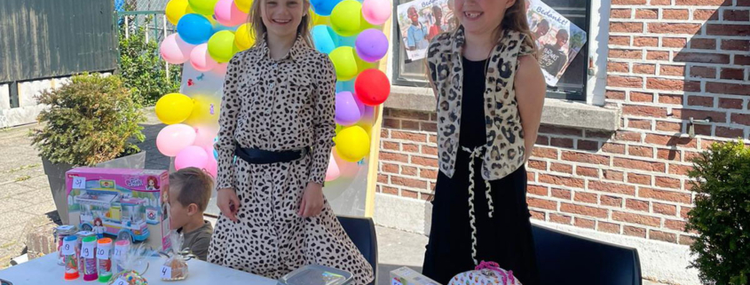 Charlotte Tabbers (7) en Naomi van Beek (6) hebben samen een verkoping geregeld met 3 activiteiten, namelijk een ballon prikken met een nummertje waarvoor je een prijsje ontvangt. De prijsjes zijn door de dames met zorg uitgekozen en geselecteerd. Van zelfgemaakte armbanden tot tassen, boeken en bellenblazen! Daarnaast een verkoop van drinken en het versieren van een cakeje.