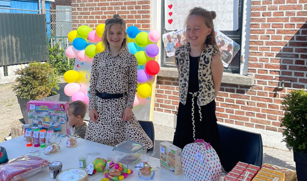 Charlotte Tabbers (7) en Naomi van Beek (6) hebben samen een verkoping geregeld met 3 activiteiten, namelijk een ballon prikken met een nummertje waarvoor je een prijsje ontvangt. De prijsjes zijn door de dames met zorg uitgekozen en geselecteerd. Van zelfgemaakte armbanden tot tassen, boeken en bellenblazen! Daarnaast een verkoop van drinken en het versieren van een cakeje.