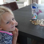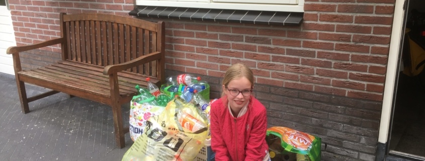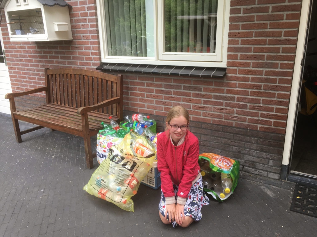“In de Coronatijd waren we veel thuis en we waren best snel klaar met ons thuiswerk. Toen ben ik begonnen met een lege flessen inzamelactie. Soms alleen en soms ook met een buurmeisje of een zusje. Op de foto sta ik met een deel van de flessen. Bij elkaar hebben we € 40,45 opgehaald. Dat maakt mama nu aan jullie over.”