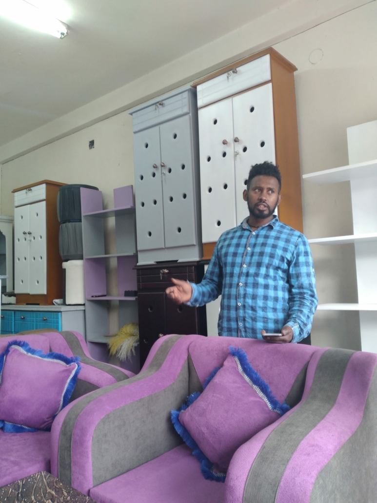 Dereje is eigenaar van Naro Furniture. Naast de fysieke winkel zet hij Telegram (vergelijkbaar met WhatsApp) in om digitaal zijn meubels te promoten. Ook privé gaat het goed. Dereje is getrouwd en vader van één kind. ‘Ik heb nog altijd dezelfde regels voor spaargeld als eerst. Ik breng mijn vrije tijd vooral thuis door en ik gebruik Wifi in plaats van mobiele data.’