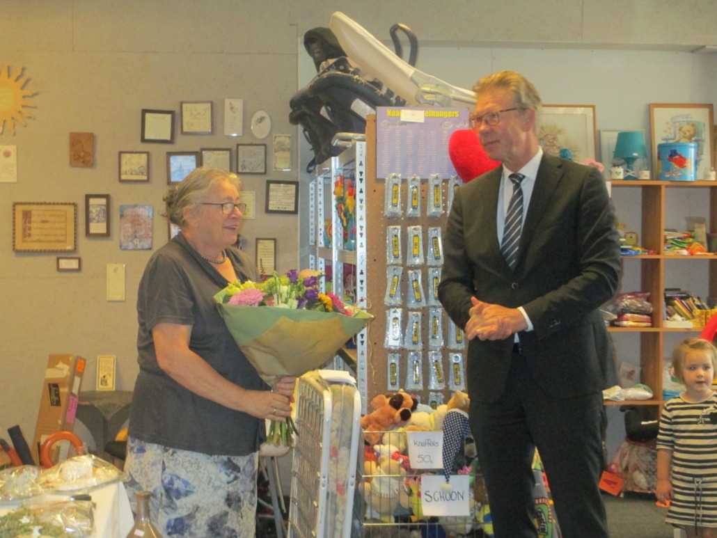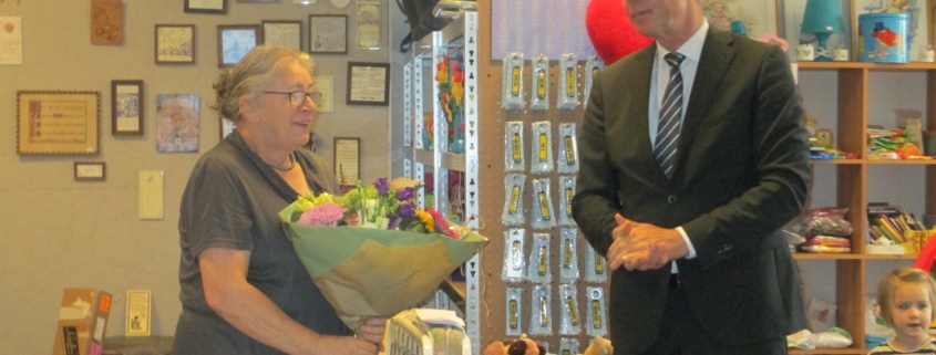 Na de toespraak van de wethouder was er gelegenheid om Dirkje te feliciteren en koffie te drinken in de winkel.
