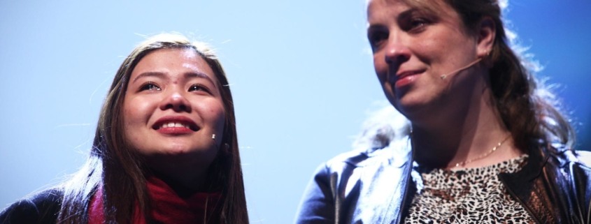 Another story full of storms was told by Kate Ann Micosa, a former sponsor child and student at ASHTEC. Kate told that when she was young life was not easy. ‘I still remember the days we had to skip a meal, because my father had not earned enough that day.’ Her life changed when her parents were approached by a partner of Woord en Daad, AMG Philippines, to admit Kate and her brother in the sponsor program. The greatest and most important change was that in the program, Kate got to know God and came to faith. ‘Do you realize, all sponsors that are here today? God wants to use you to get us to know the gift of the eternal life! That is the best you can ever do for us.’ After this beautiful story Kate’s sponsors stepped on stage. Erik and Jenneke Donkersteeg told how special it was for them to meet Kate in person. ‘What once started with a small picture at an introduction fair, now stands next to us in person.‘ Kate got tears in her eyes when she told that it was a dream coming true to stand next to her sponsors. ‘And to finally thank them in person for what they mean to me.’