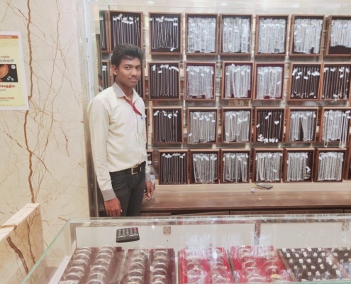 ‘Er is een strikte lockdown, schoonmakers verspreiden desinfecterende middelen op straat en er is financiële hulp en basisproducten worden uitgedeeld,’ vertelt Vinisha over de maatregelen in Kumbakkonam. Vinisha werkt sinds januari 2020 op de sieradenafdeling één van de filialen van Saravan Stores. Haar collega Ranjith voegt nuchter toe: ‘Er zijn verschillende maatregelen genomen, maar wij zijn veilig. We moeten thuisblijven, dat is alles.’ Hij werkt sinds december als verkoper in de winkel. Ook hij kwam thuis te zitten toen de winkels hun deuren moesten sluiten. De jongeman is nuchter. ‘Ik pas me aan de nieuwe situatie aan. Ik zorg goed voor mijn eigen hygiëne en ik krijg nog salaris. Een deel daarvan spaar ik.’