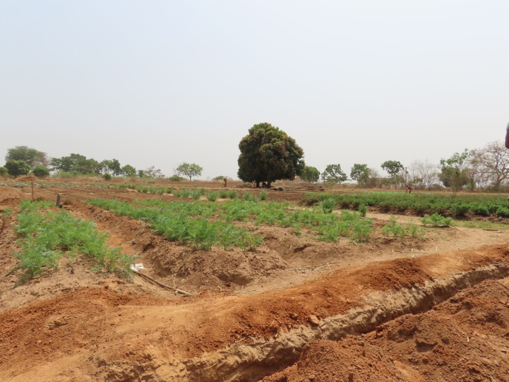 Enkele honderden meters achter het hoofdgebouw liggen de velden waar groenten geteeld worden. Eén grote boom achterop het veld biedt schaduw, maar de wortels en witte kool moeten overleven onder de brandende zon. Twee jongens werken aan het watersysteem. Bij elk veldje wordt een kraan aangelegd.