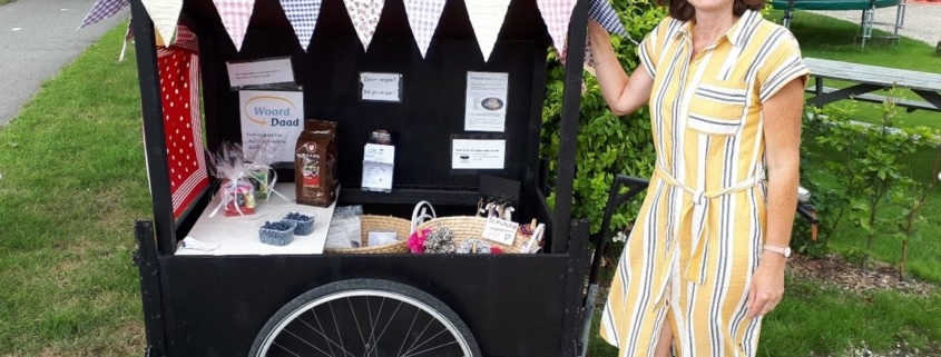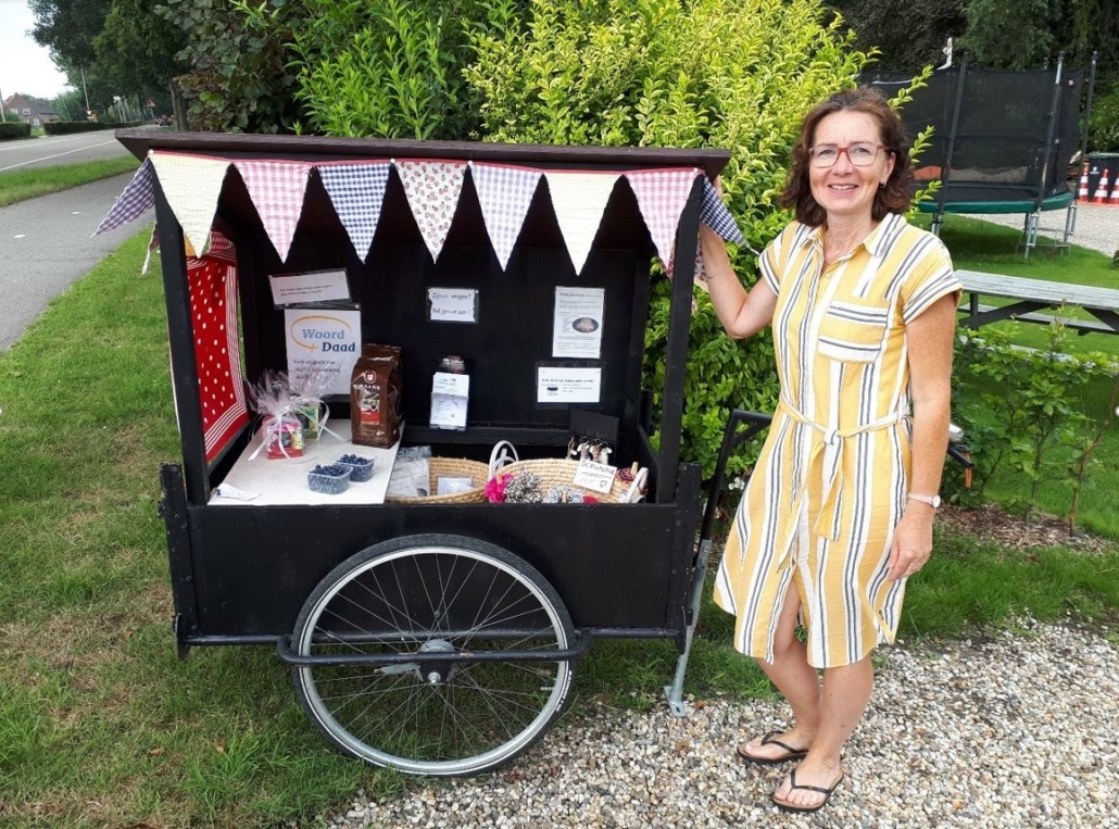 Margriet de Vos woont in het mooie buitengebied van Leerdam en heeft een naaiatelier aan huis, wat ze combineert met de verkoop van de producten van Woord en Daad. De producten verkoopt ze zowel in een bakfiets aan de weg als in een tot atelier omgebouwde kamer in huis. ‘Mijzelf inzetten voor mijn naaste dichtbij en ver weg blijft mijn stimulans!’