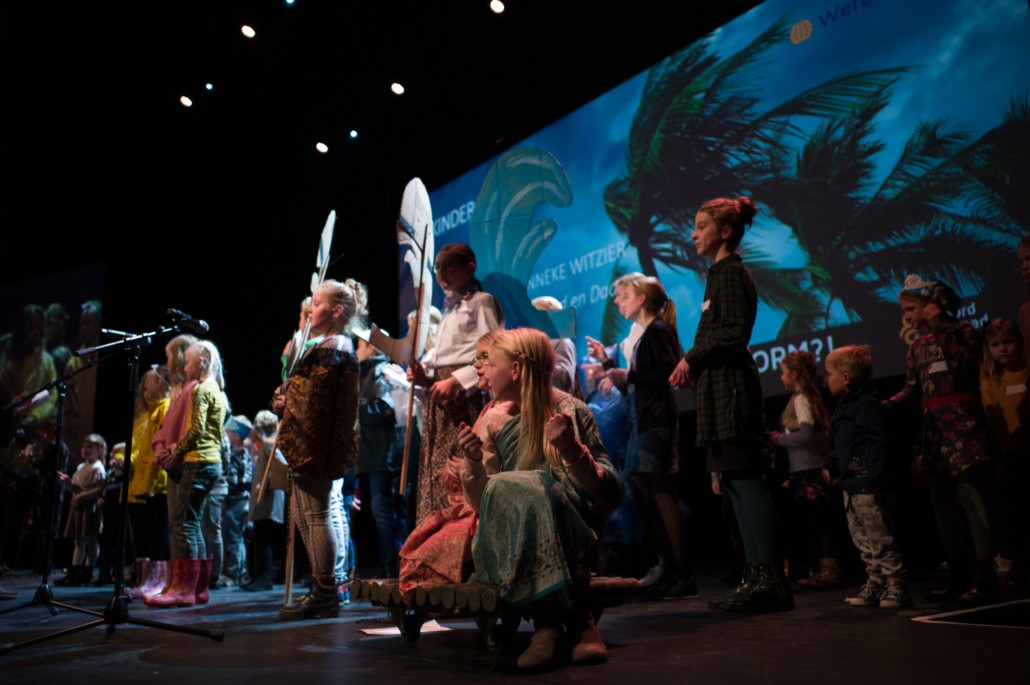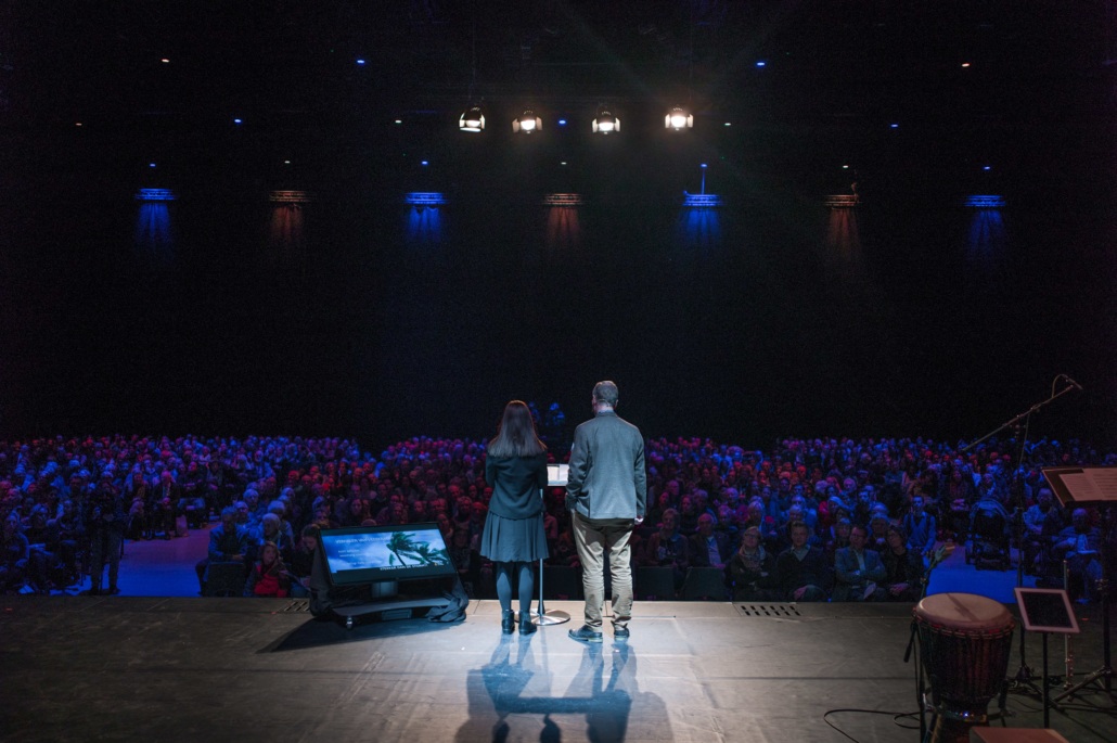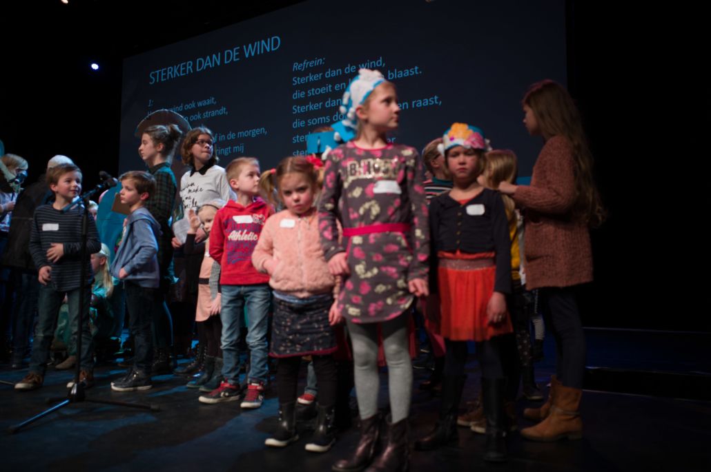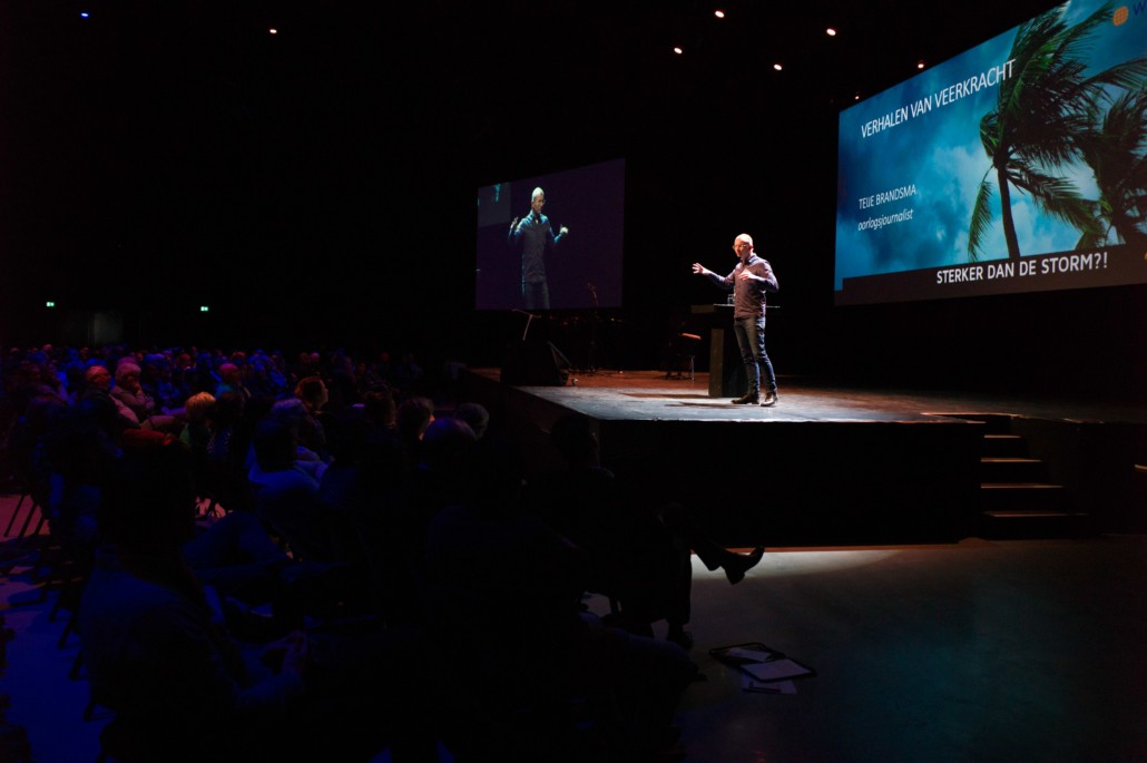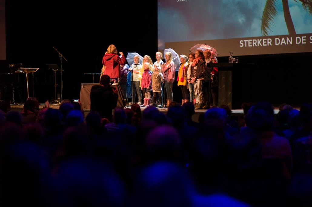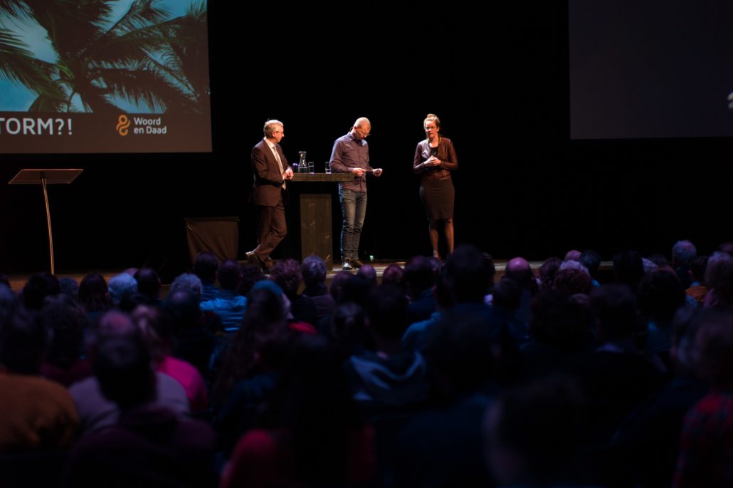 Om 13:45 begon het hoofdprogramma weer, met het stormachtige liedje ‘Sterker dan de Wind’ van kinderkoor De Vuurpijl. Oorlogsjournalist Teije Brandsma deelde welke stormen, letterlijk en figuurlijk, hij is zijn baan gezien heeft. ‘Als ik dan een stad zie die helemaal verwoest is door oorlogsgeweld, gezinnen die uit elkaar zijn gerukt en mensen die geen thuis meer hebben, dan ik realiseer ik me dat het waar is, dat ‘heel de schepping zucht’.’ Na zijn verhaal nodigde Teije Steef de Bruijn, hoofdredacteur van het RD en Tineke Morren, projectleider Noodhulp bij Woord en Daad, op het podium. Wat is de rol van christelijke journalistiek in de noodhulp verslaglegging, vroeg Teije aan Steef de Bruijn. ‘Juist ook als christenen moeten we kritisch blijven op hoe we noodhulpgeld besteden. Want we hebben een Bijbelse opdracht gekregen om er te zijn voor de mensen in nood.’ Tineke Morren reageerde: ‘Die opdracht kunnen we als Woord en Daad niet alleen, en we zijn dagelijks verwonderd door de steun en het gebed van alle mensen hier in de zaal.’