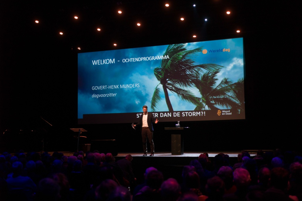 Afgelopen zaterdag 19 januari beleefden bijna 1.400 mensen de Woord en Daad Werelddag. Jong en oud kwam naar Barneveld voor indrukwekkende verhalen van verschillende sprekers, unieke beelden en de gezellige wereldmarkt. Om 09:15 gingen de deuren van de Midden Nederland Hallen open en verwelkomden we bezoekers uit alle hoeken van het land, van Hoogeveen tot Middelburg. De dag begon met de vraag die vandaag centraal zou staan: ‘Zijn wij sterker dan de storm?’