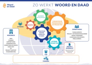 Woord en Daad werkt projectmatig. Dat betekent dat we al ons werk organiseren in projecten. Dit stelt ons in staat om efficiënt en flexibel te werken en snel in te kunnen spelen op nieuwe ontwikkelingen. Onderstaande afbeelding illustreert de projectmatige manier van werken.