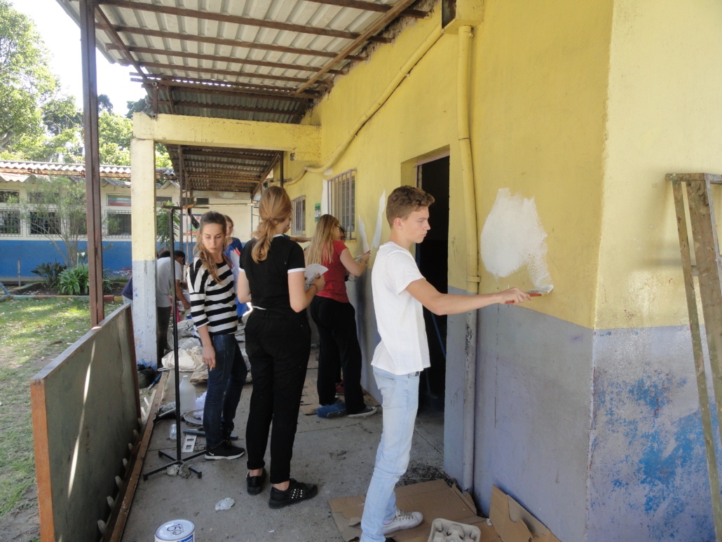 Daar hebben we friet gegeten met de buddy’s en gingen we klussen. Mevrouw Blokland heeft een muurschildering ontworpen voor het muziekhok en daar zijn we ook aan begonnen. Maandag hopen we de schildering af te maken. Praten met de buddy’s was helaas erg lastig omdat ze nauwelijks Engels konden. Toch hebben we contact gemaakt met behulp van een fotoboekje en onze begeleider die wilde vertolken. We hopen de buddy’s maandag weer te zien.