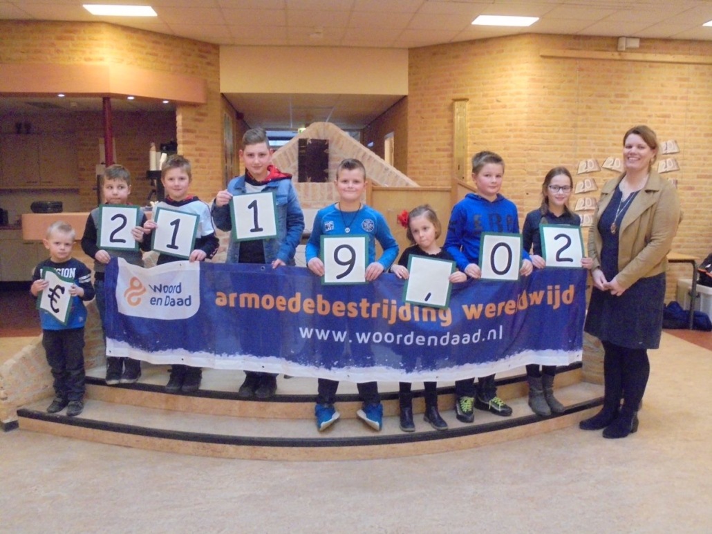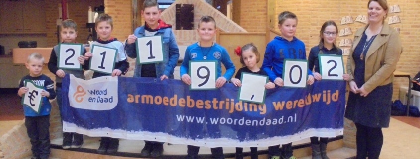 Wat dat bedrag nu precies was geworden was ook voor Woord en Daadvoorlichter Janneke Witzier nog een flinke puzzel. Acht kinderen met briefjes vol getallen en symbolen moesten eerst nog in de goede volgorde gezet worden. Uiteindelijk lukte het en werd het prachtige bedrag zichtbaar: € 2.119,02!